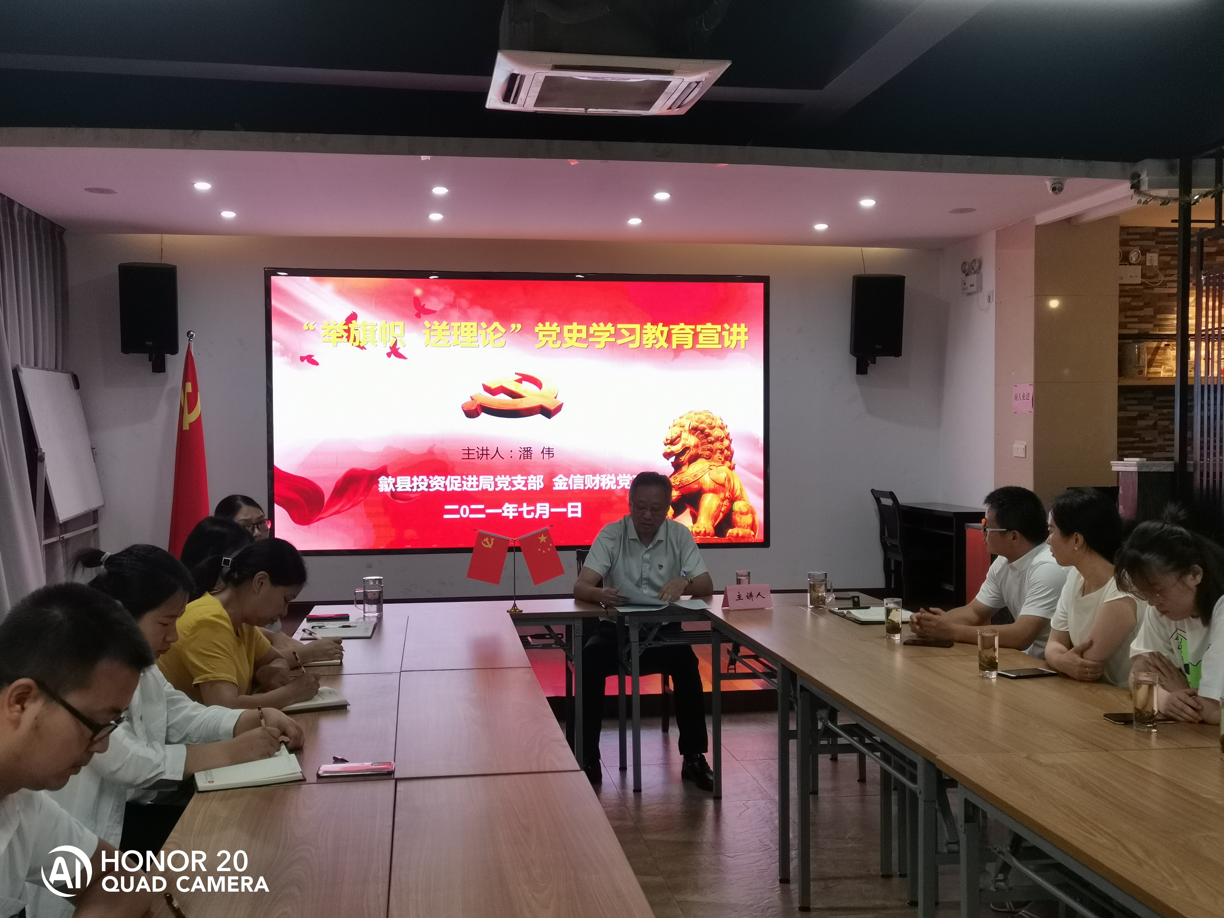 慶祝大會(huì)直播觀看結(jié)束后,歙縣投資促進(jìn)局黨支部書(shū)記、局長(zhǎng)潘偉親自進(jìn)行“舉旗幟 送理論”的黨史學(xué)習(xí)教育宣講,飽含深情從四個(gè)方面進(jìn)行闡述:一是深入學(xué)習(xí)領(lǐng)會(huì)習(xí)近平總書(shū)記關(guān)于黨的歷史重要論述,充分認(rèn)識(shí)開(kāi)展黨史學(xué)習(xí)教育的重大意義;二是認(rèn)真研讀黨史基本著作,全面了解中國(guó)共產(chǎn)黨百年奮斗的光輝歷程和歷史性貢獻(xiàn);三是深刻把握開(kāi)展黨史學(xué)習(xí)教育的重點(diǎn);四是開(kāi)展黨史學(xué)習(xí)教育,要學(xué)懂弄通做實(shí)習(xí)近平新時(shí)代中國(guó)特色社會(huì)主義思想,增強(qiáng)“四個(gè)意識(shí)”、堅(jiān)定“四個(gè)自信”、做到“兩個(gè)維護(hù)”。潘偉書(shū)記穿插講述了中國(guó)共產(chǎn)黨百年的不屈不撓奮進(jìn)史,革命先烈為了實(shí)現(xiàn)共產(chǎn)主義這個(gè)終極奮斗目標(biāo)拋頭顱、灑熱血的戰(zhàn)斗故事,并結(jié)合當(dāng)前社會(huì)發(fā)展形勢(shì),鼓舞年輕黨員要不畏艱難、積極奮斗、順勢(shì)而為,為歙縣經(jīng)濟(jì)發(fā)展貢獻(xiàn)自己的最大的力量。