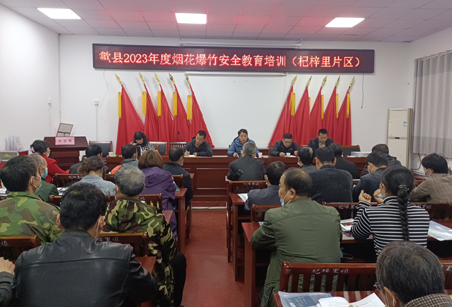 當前至2023年元旦、春節、元宵期間,是全縣煙花爆竹經營零售旺季,也是事故多發、易發期,為保障煙花爆竹經營零售安全,嚴防事故發生,根據《安全生產法》、《煙花爆竹安全管理條例》法律法規的規定2022年11月28日-12月5日,由歙縣應急管理局主辦,安徽正億安全技術服務有限公司承辦的歙縣2023年度煙花爆竹經營戶安全教育培訓在杞梓里、三陽、街口、長陔等八個鄉鎮集中點順利開班。來自全縣28個鄉鎮共615名煙花爆竹經營戶負責人參加培訓,應急管理局許明武副局長場并做開班講話。